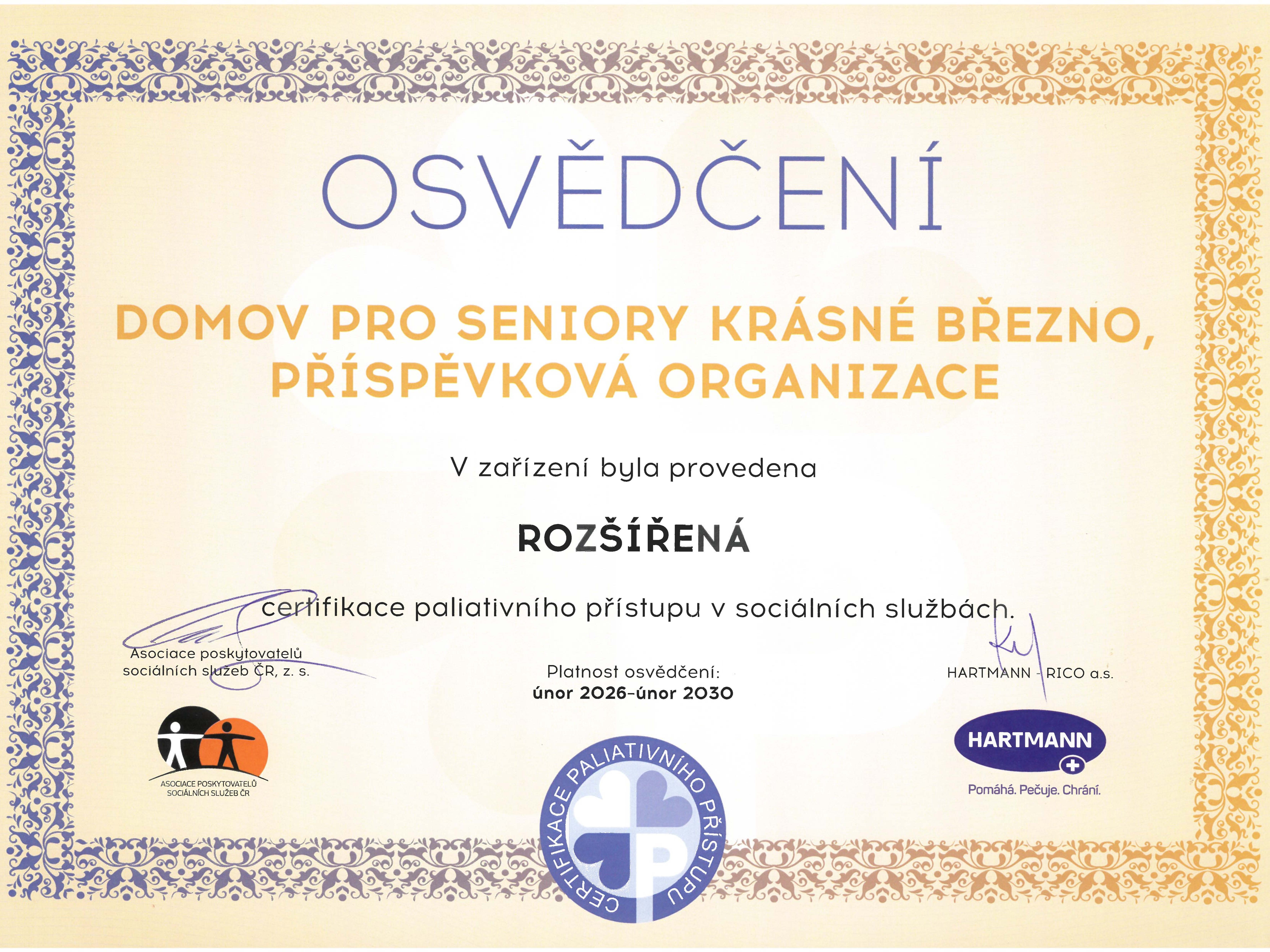 Díky trpělivosti a intenzivní práci se zaměstnancům podařilo na prosincovém auditu Asociace poskytovatelů sociálních služeb ČR posunout úroveň poskytované a certifikované paliativní péče na nejvyšší příčku. Tento certifikát paliativního přístupu v sociálních službách v rozšířené zlaté úrovni získalo dosud pouze dvanáct organizací v ČR a Domov pro seniory Krásné Březno je nyní jedním z nich.