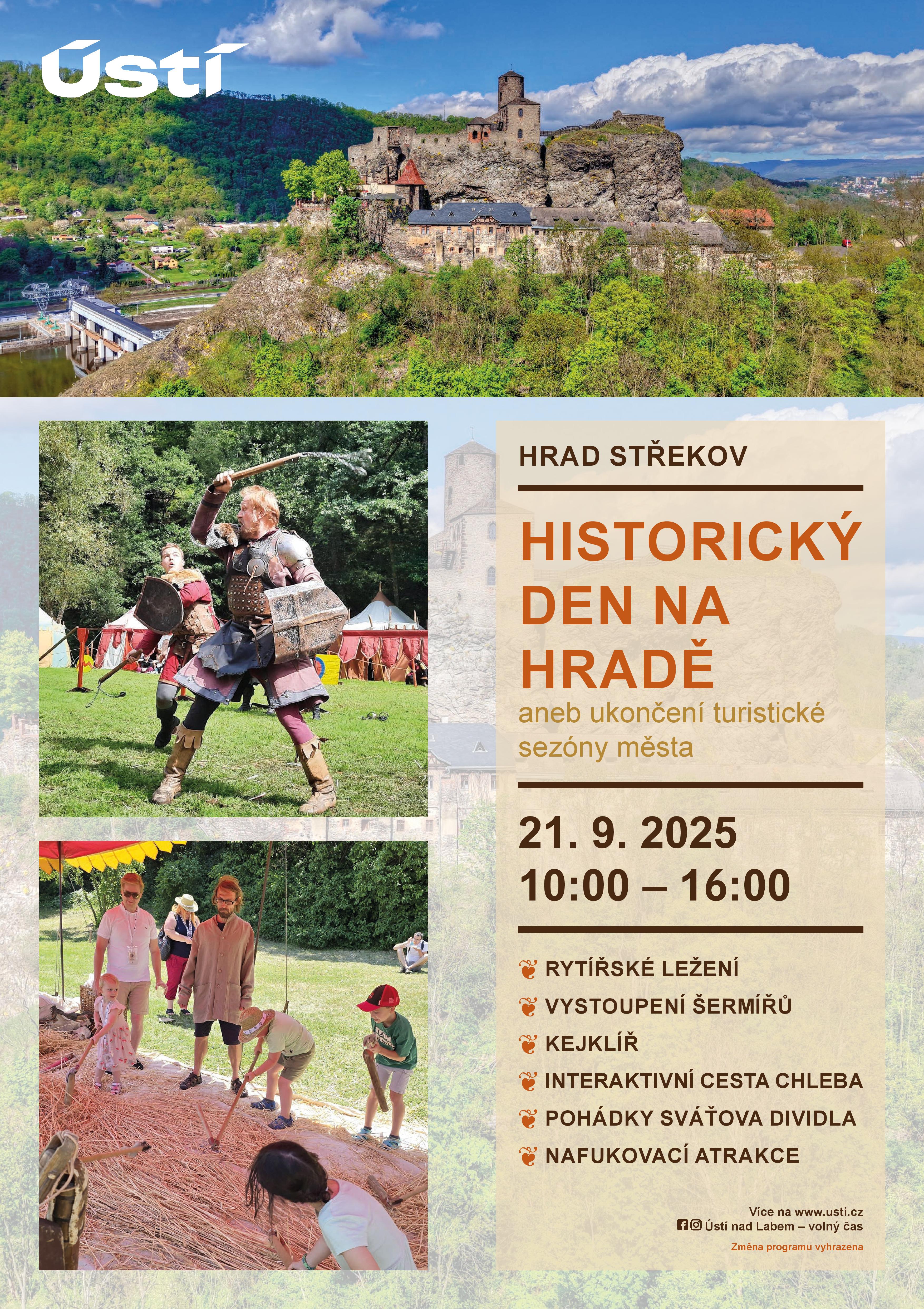 Milovníci historie, dobrodružství i rodinné zábavy pozor. Nezapomeňte si v kalendáři zakroužkovat neděli 21. 9. 2025. Od 10:00 do 16:00 ožije hrad Střekov velkolepou akcí – Historickým dnem plným rytířů, kejklířů a pohádek.