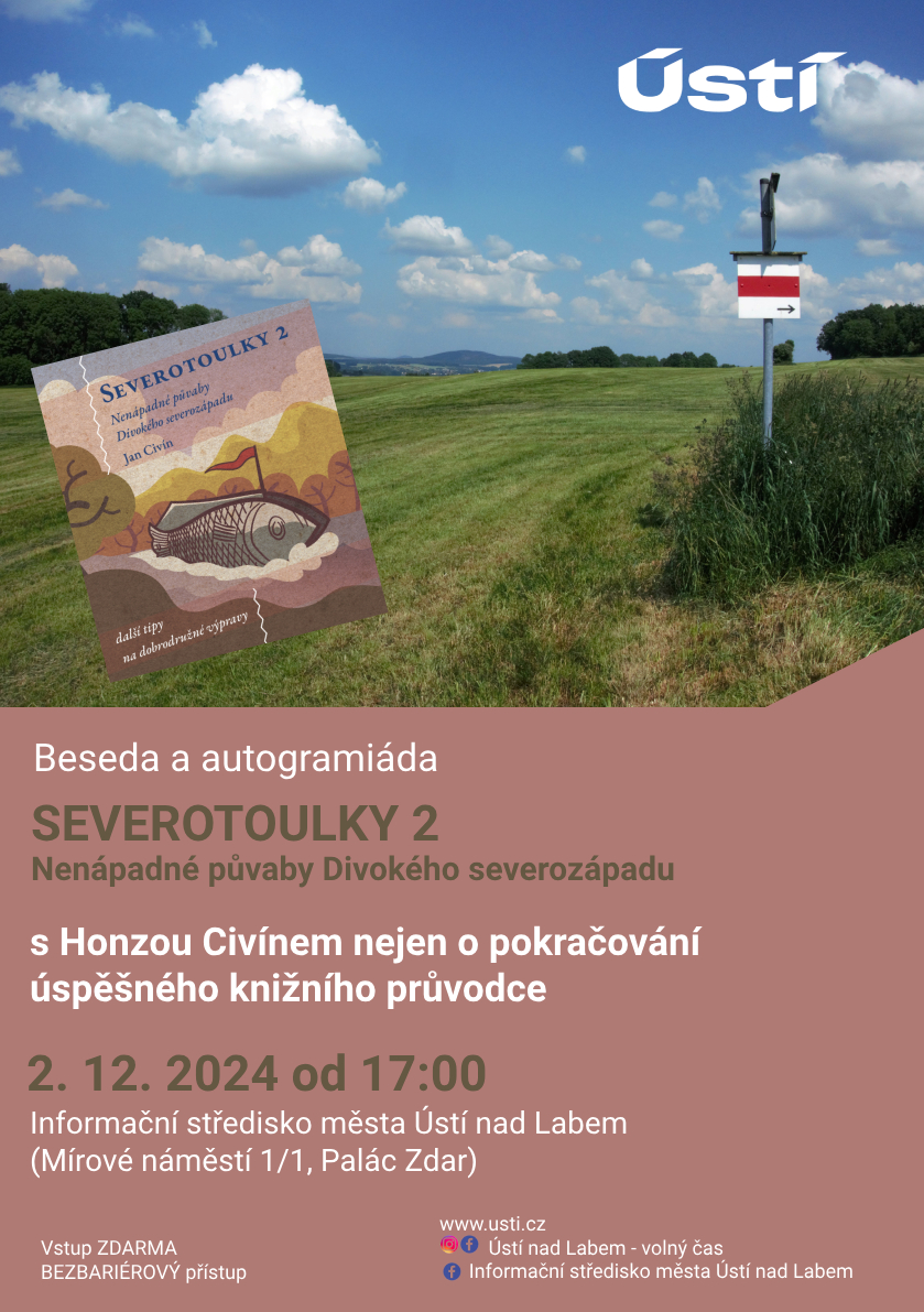 Na začátku loňského roku byla v Informačním středisku města Ústí nad Labem představena kniha Jana Civína Severotoulky. Měla obrovský úspěch a během několika týdnů byla vyprodána. Nyní Vás zveme na besedu věnovanou 2. dílu tohoto netradičního průvodce s podtitulem Nenápadné půvaby Divokého severozápadu.