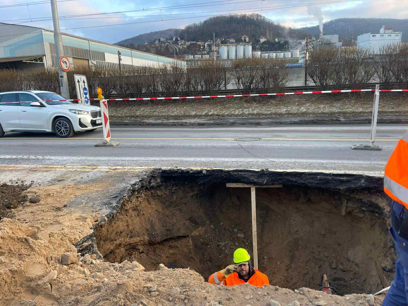 Upozornění na propad vozovky na Střekově
