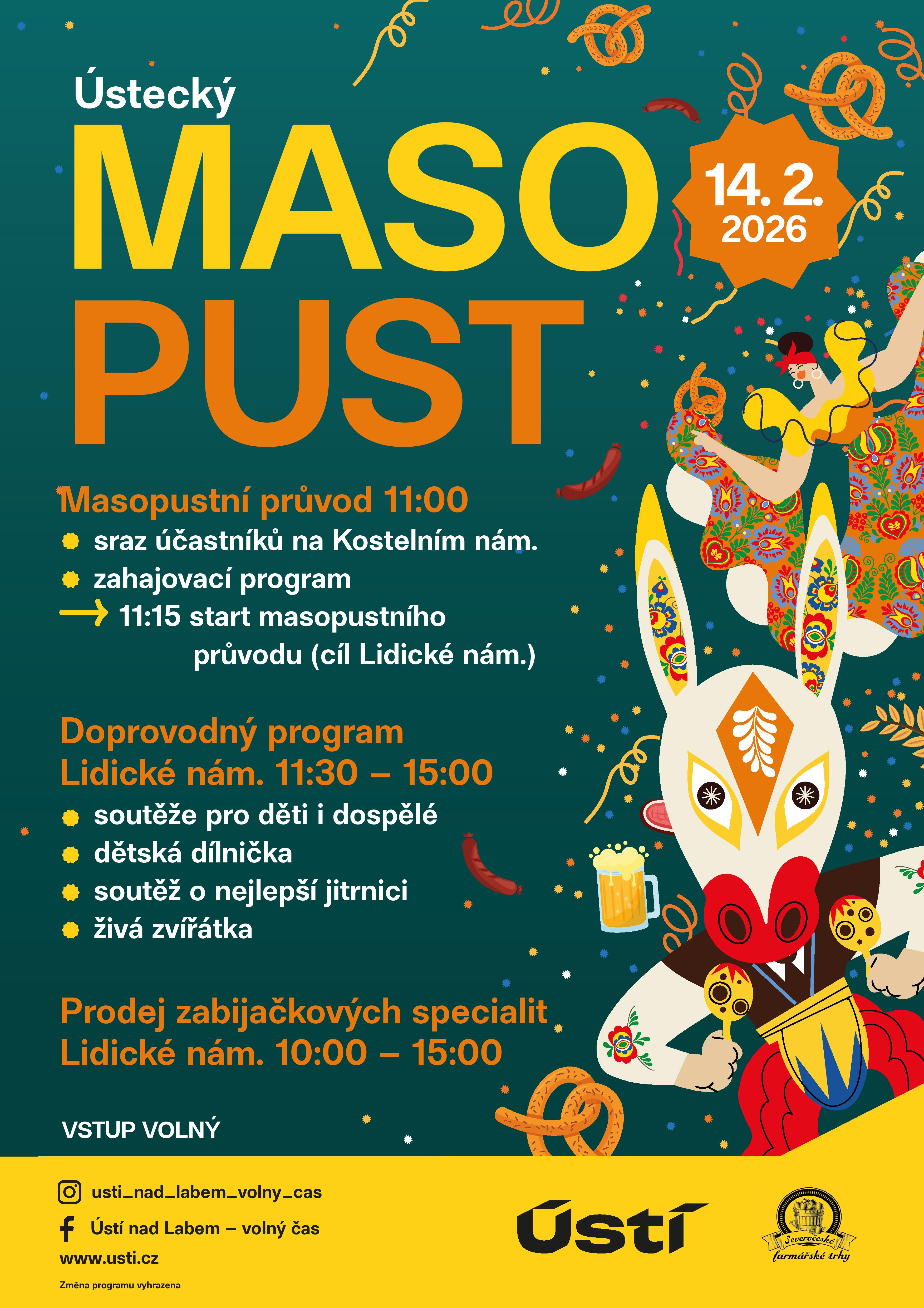 Masopust je zpět a s ním i den, kdy se centrum města zaplní maskami, smíchem a vůní tradičních dobrot. Přijďte si užít veselou atmosféru, setkat se s přáteli a strávit příjemný čas s celou rodinou během Ústeckého Masopustu, který se uskuteční v sobotu 14. února 2026.