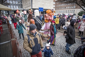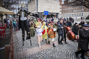 Ústecký masopust tentokrát odstartoval na Kostelním náměstí, kde své umění předvedli chůdaři ze skupiny Živa Poppy Teatre. Nechyběla muzika, skvělé akrobatické kousky i menší ohnivá show. Pak už se účastníci seřadili do masopustního průvodu, který hudbou doprovázela živá kapela z Mostu. Nepřehlédnutelné byly i vozy s obřími maskami Divadla KVELB. Průvod prošel Klášterní ulicí na Mírové náměstí a pokračoval přes atrium magistrátu na Lidické náměstí. Zde mohli diváci vidět tradiční věšení basy, kterou předvedli herci z Mladé scény.