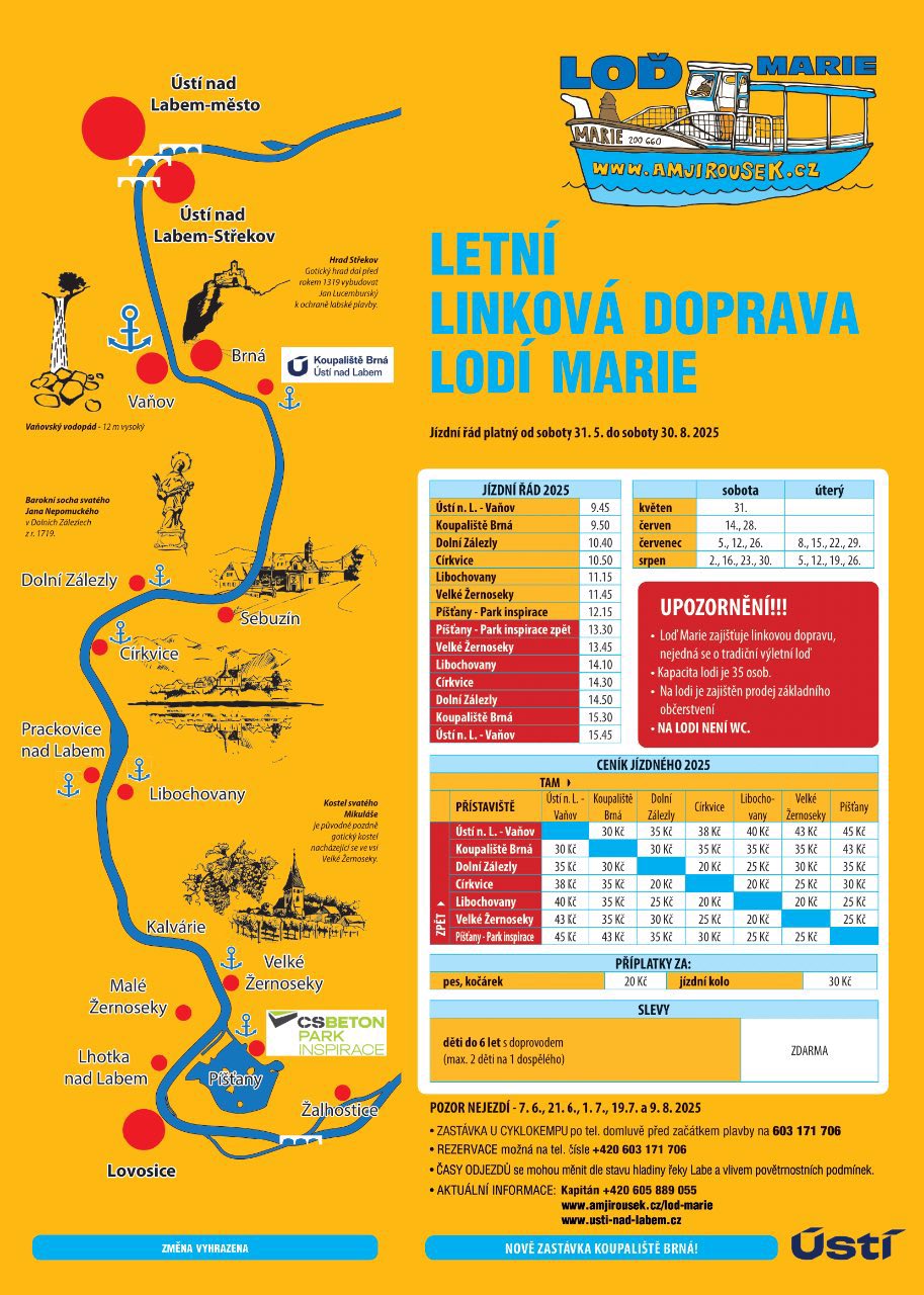 Menší loď Marie je ideální pro rodiny s dětmi nebo seniory. Užít si můžete pohodovou plavbu z Vaňova přes Brnou, Dolní Zálezly, Libochovany až do Píšťan a zpět. Loď pluje ve vybraných dnech až do konce srpna.