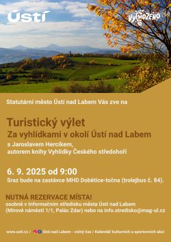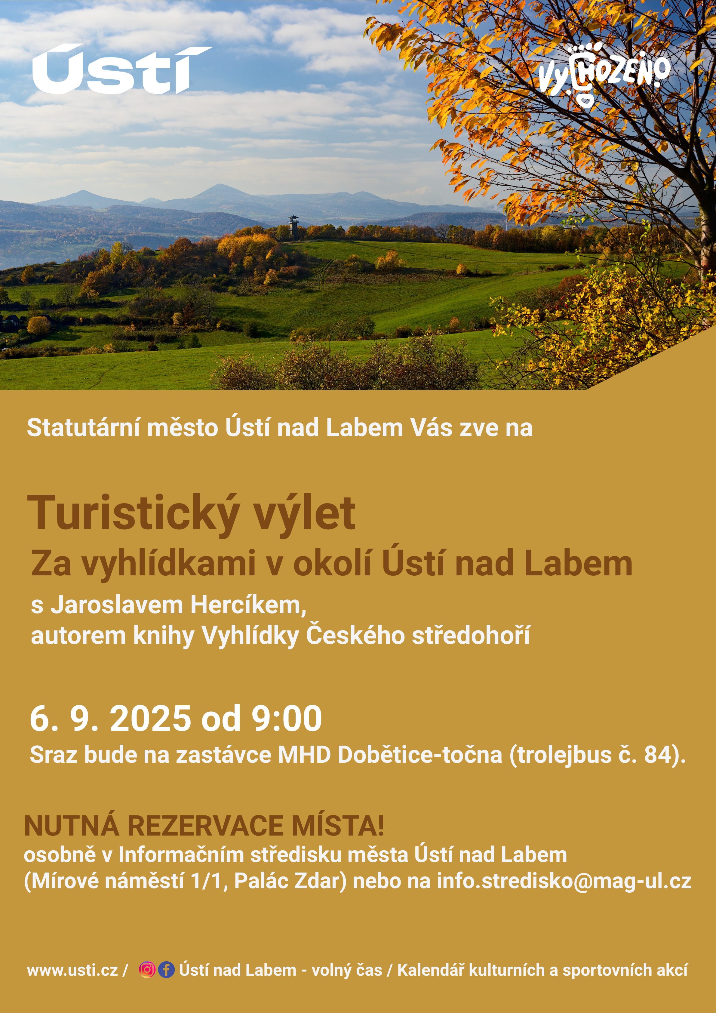 Začněte září aktivně s oddělením cestovního ruchu Magistrátu města Ústí nad Labem. Zveme Vás na turistický výlet Za vyhlídkami v okolí Ústí nad Labem, po kterých Vás provede Jaroslav Hercík, autor úspěšné knihy Vyhlídky Českého středohoří.