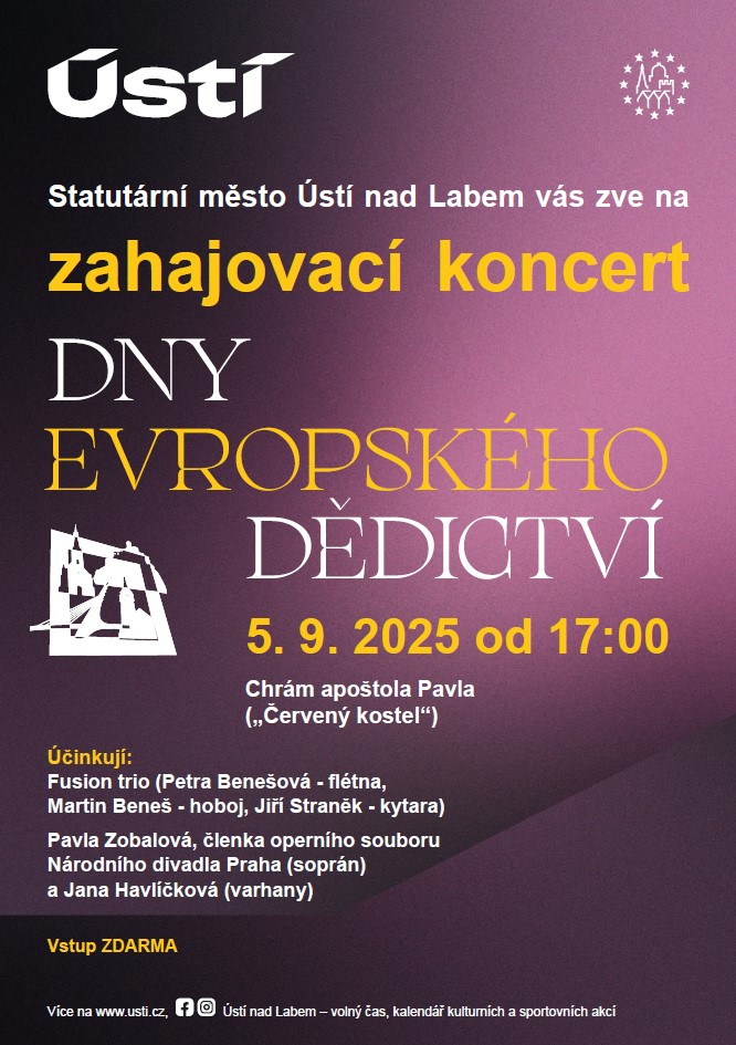 Statutární město Ústí nad Labem srdečně zve všechny milovníky hudby a kultury na slavnostní zahajovací koncert Dnů evropského dědictví, který se uskuteční v pátek 5. září 2025 od 17:00 v Chrámu apoštola Pavla ("Červený kostel").
