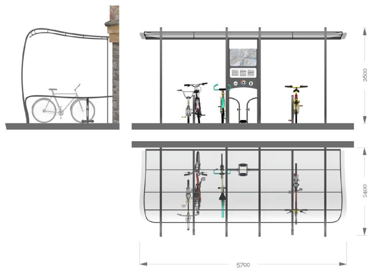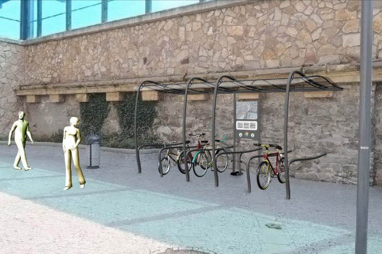 Krytý stojan architekta Jana Soukupa umožní střednědobé zaparkování deseti kol pod přístřeškem, nabídne cykloinformace o městě a díky vestavěnému zařízení i několik hravých prvků reagujících na intenzitu šlapání na vestavěném trenažeru.