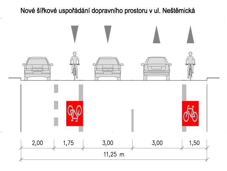 V současné době je ul. Neštěmická nepřívětivě široká třída s jedním jízdním pruhem v každém směru a se zákazem parkování po obou stranách. Nový projekt vodorovného dopravního značení navrhne uspořádání dopravy v ulici Neštěmická tak, že kromě hlavních jízdních pruhů budou nově vymezeny v prostoru komunikace i jízdní pruhy pro cyklisty v obou směrech a parkovací místa po jedné straně komunikace.