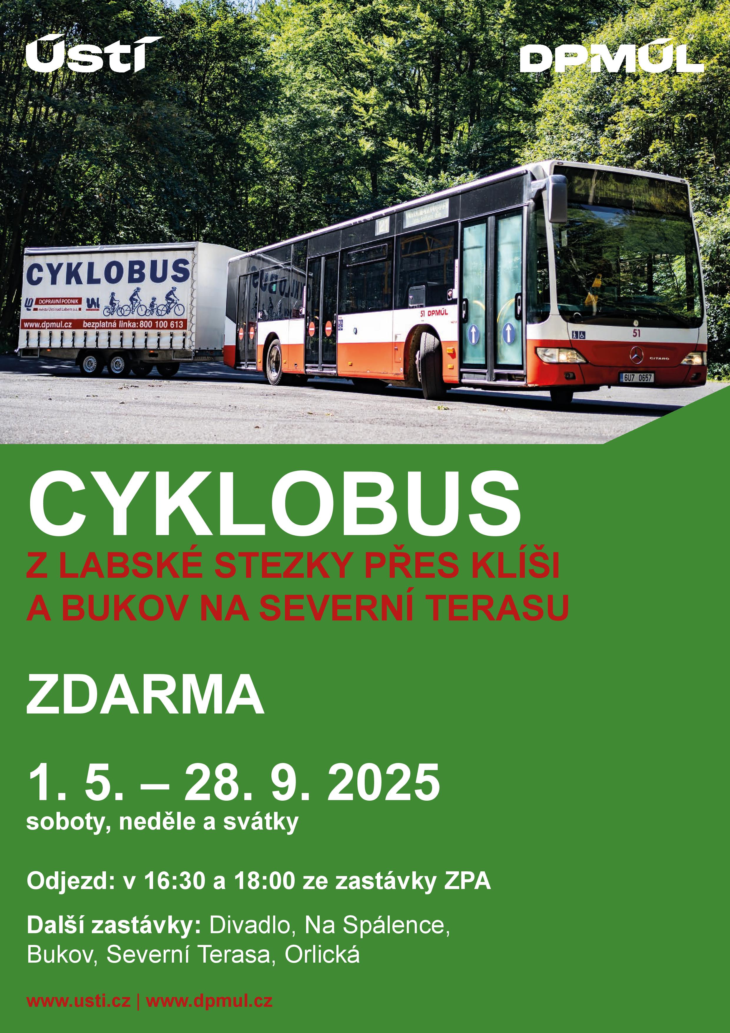 Bojujete po svém cyklovýletu s únavou a nezbývají Vám síly na průjezd městem domů? Využijte opět tradičních služeb cyklobusu z Labské stezky ZDARMA a pohodlně se dopravte do okrajových částí Ústí nad Labem. Cyklobus odstartuje svůj provoz v rámci Zahájení turistické a cyklistické sezóny města Ústí nad Labem.
