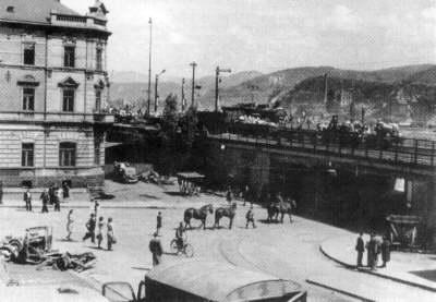 Předmostí, bílé prapory jsou již z oken ztaženy, ale ulice je