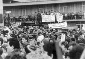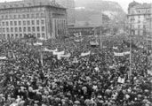 krajského výboru KSČ. Několikatisícový dav demonstrantů s vlajkami
